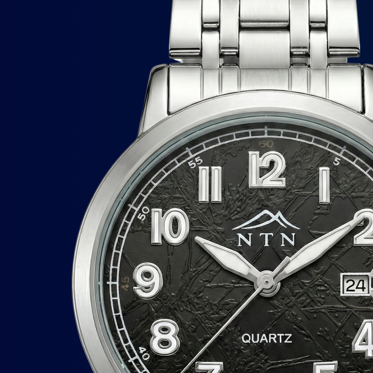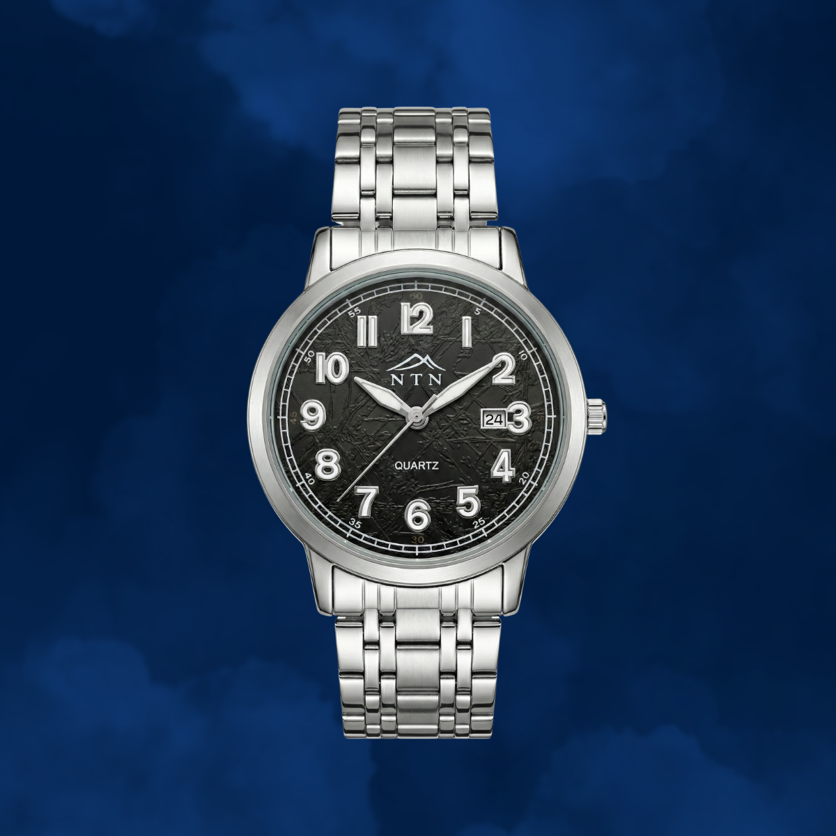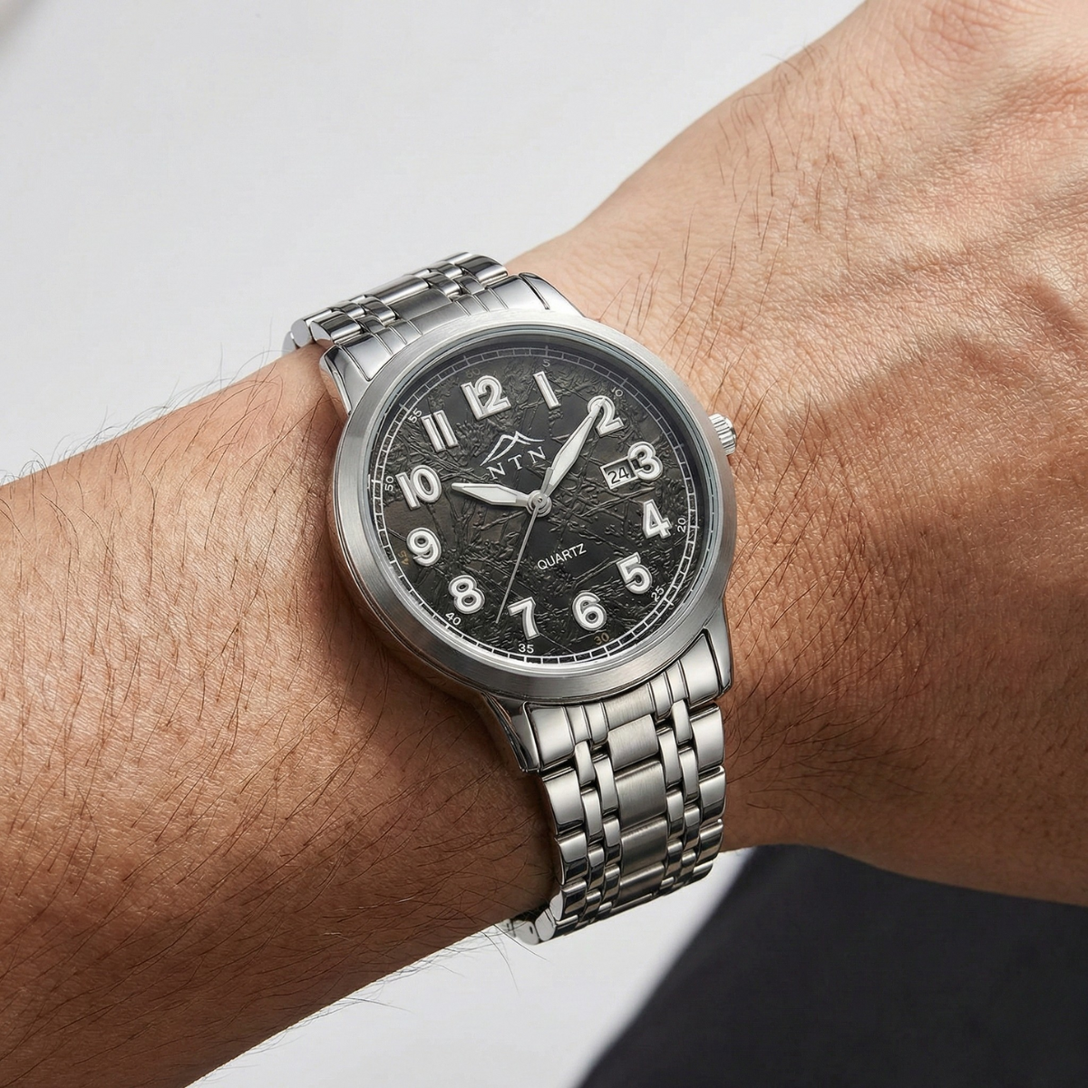 This NTN Analog watch blends a subtle patterned black dial with bold numerals and a crisp date aperture at 3 o’clock for clear, no-fuss time reading. A polished fine-alloy case and stainless steel bracelet deliver a comfortable, balanced fit and a refined shine. Powered by a dependable quartz movement, it’s designed to move seamlessly from work to weekend.