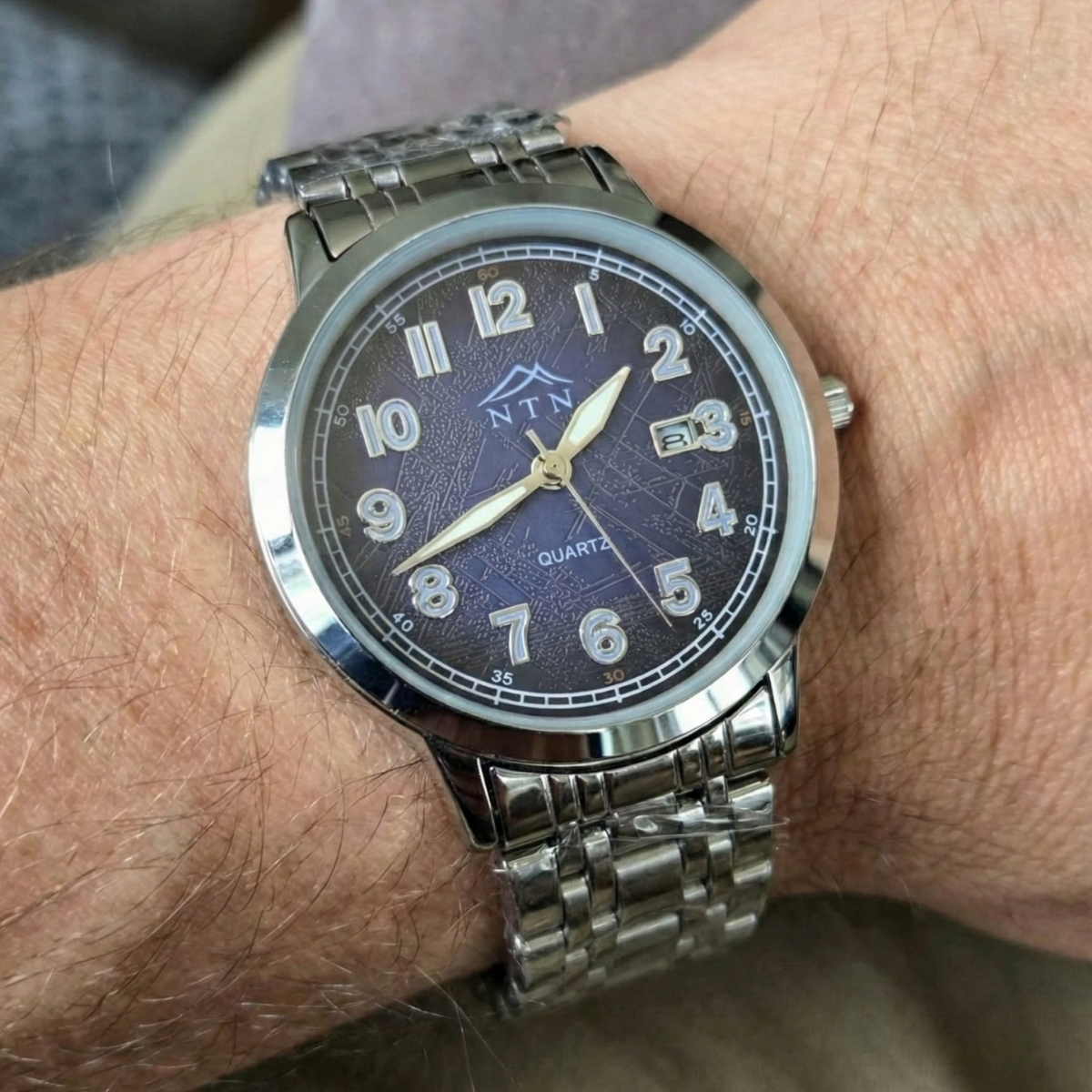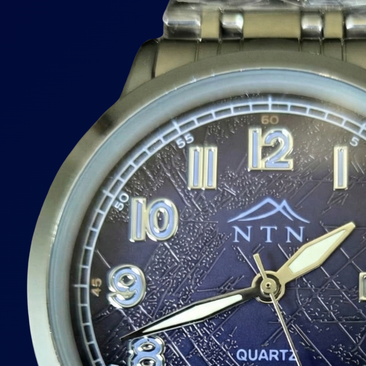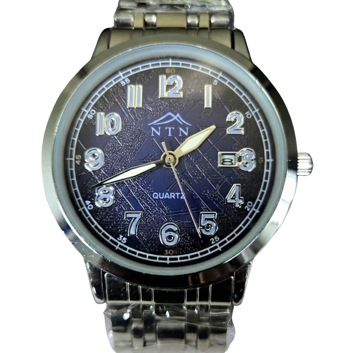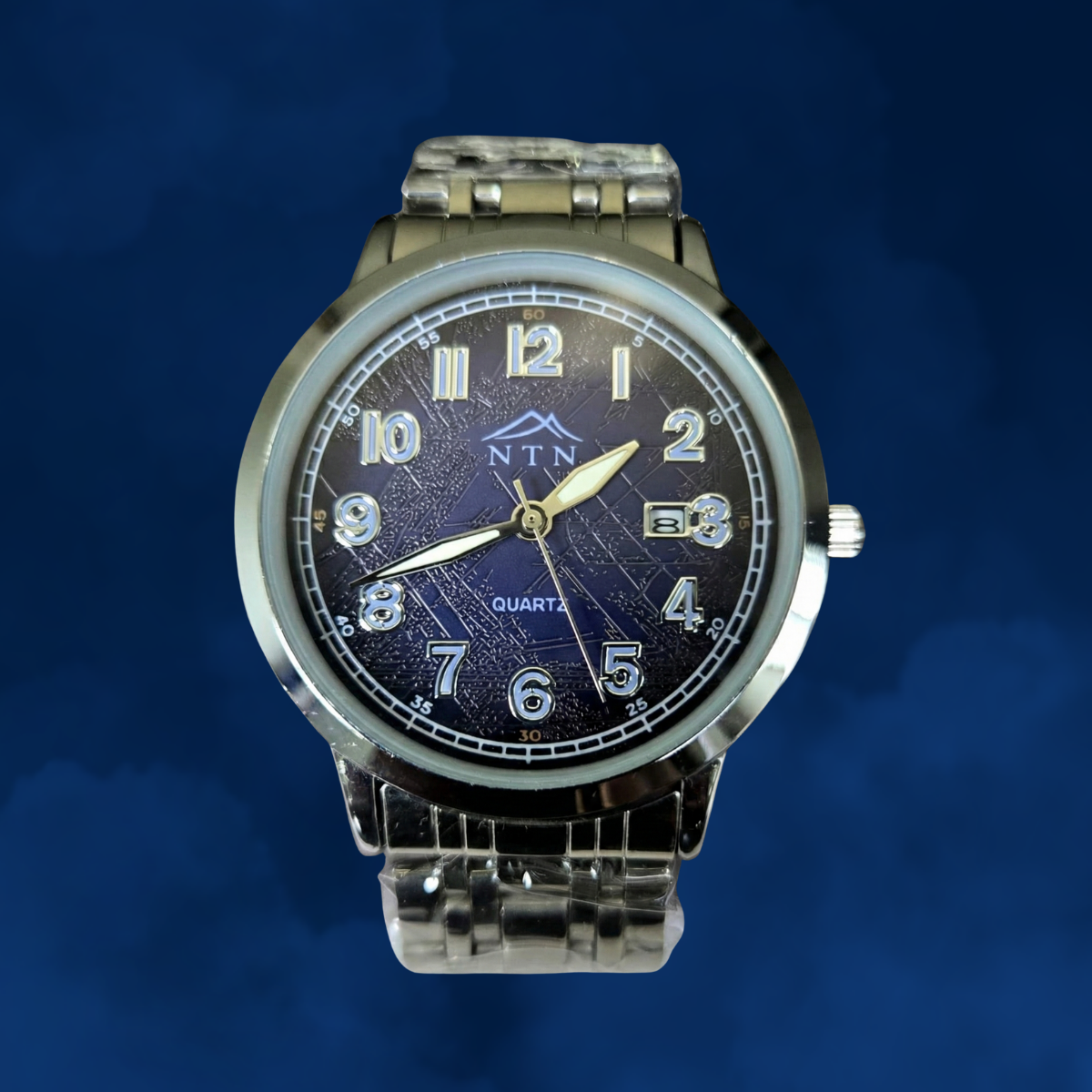 This NTN Quartz Analog watch features a striking dark blue textured dial and a robust stainless steel strap, offering both classic style and everyday functionality with its integrated date display.