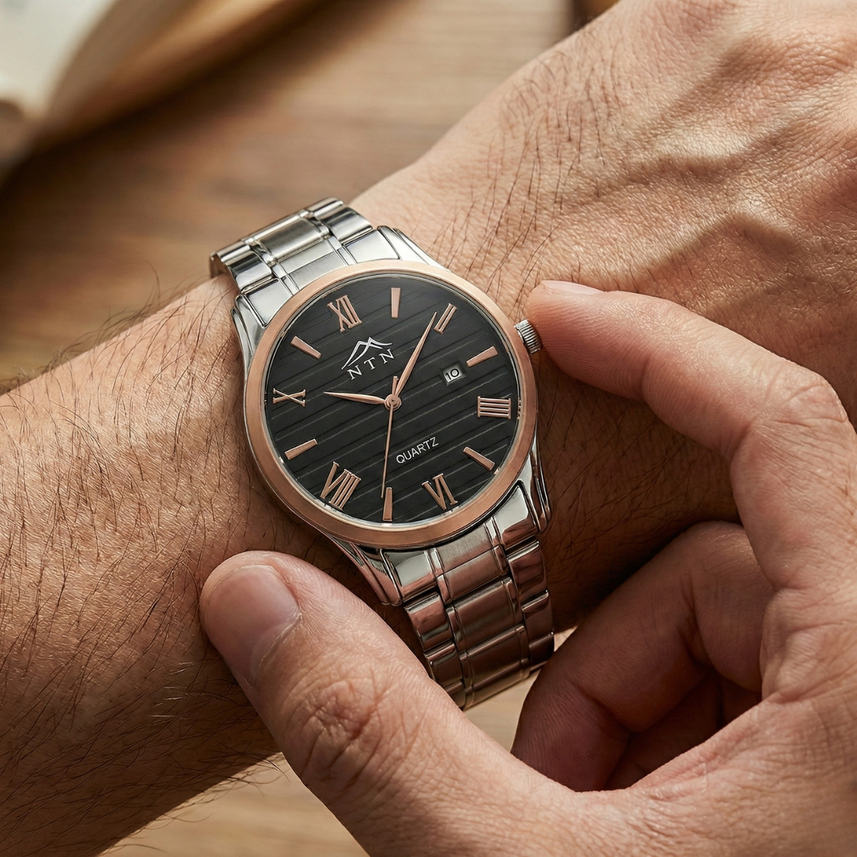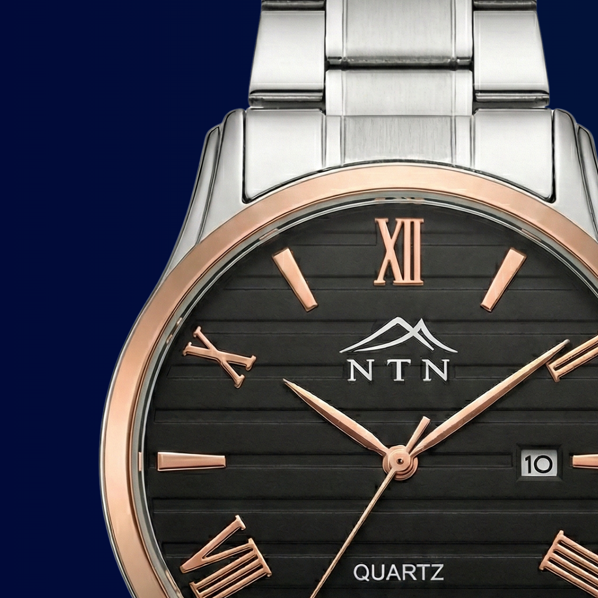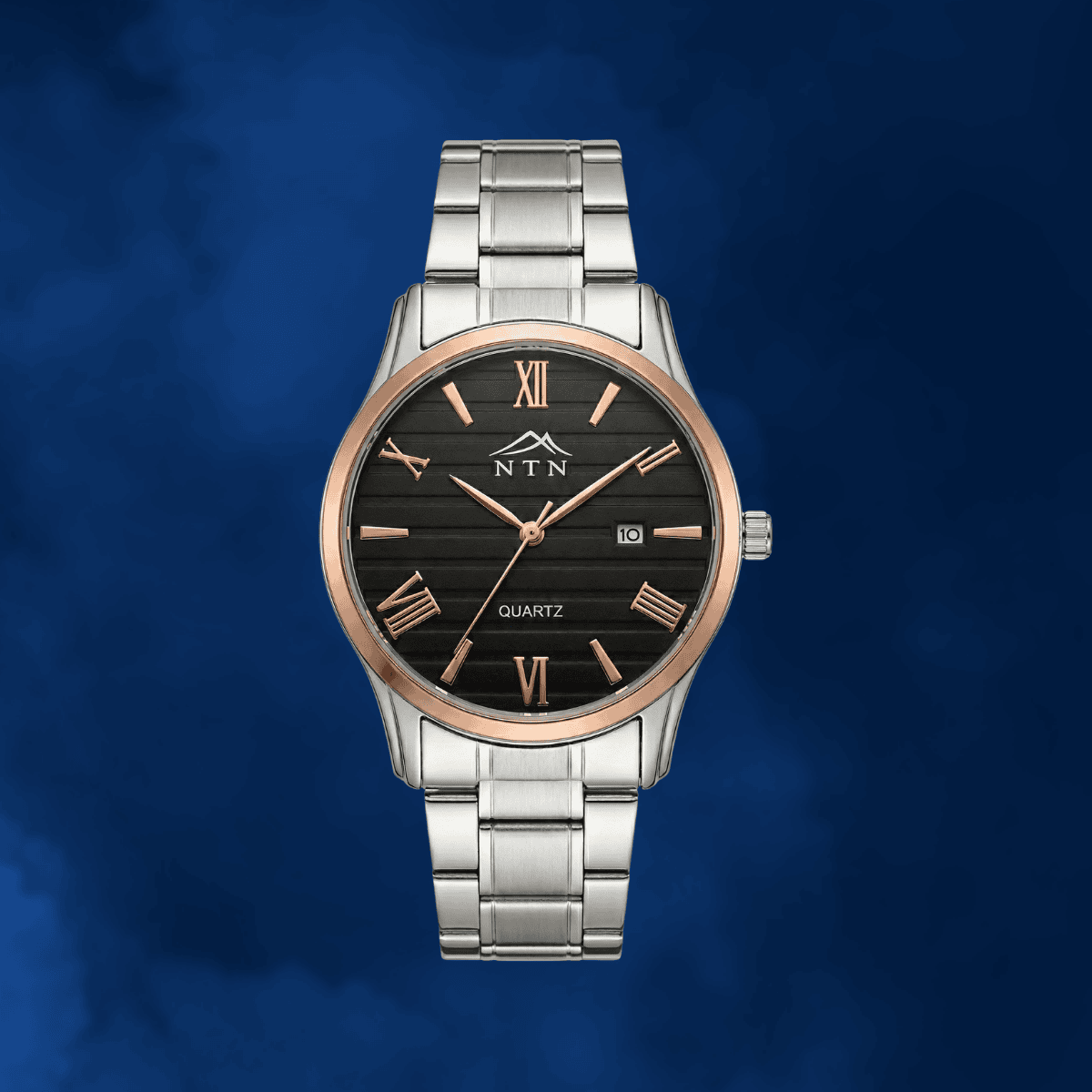 The NTN classic Analog dress watch pairs a textured black dial with rose-gold Roman indices and a polished stainless-steel bracelet for a sophisticated everyday look. Powered by a precise quartz movement, it features a handy date display at 3 o’clock and a sturdy fine-alloy case. Comfortable on the wrist and versatile enough for office or evening wear, this watch blends classic styling with reliable performance.