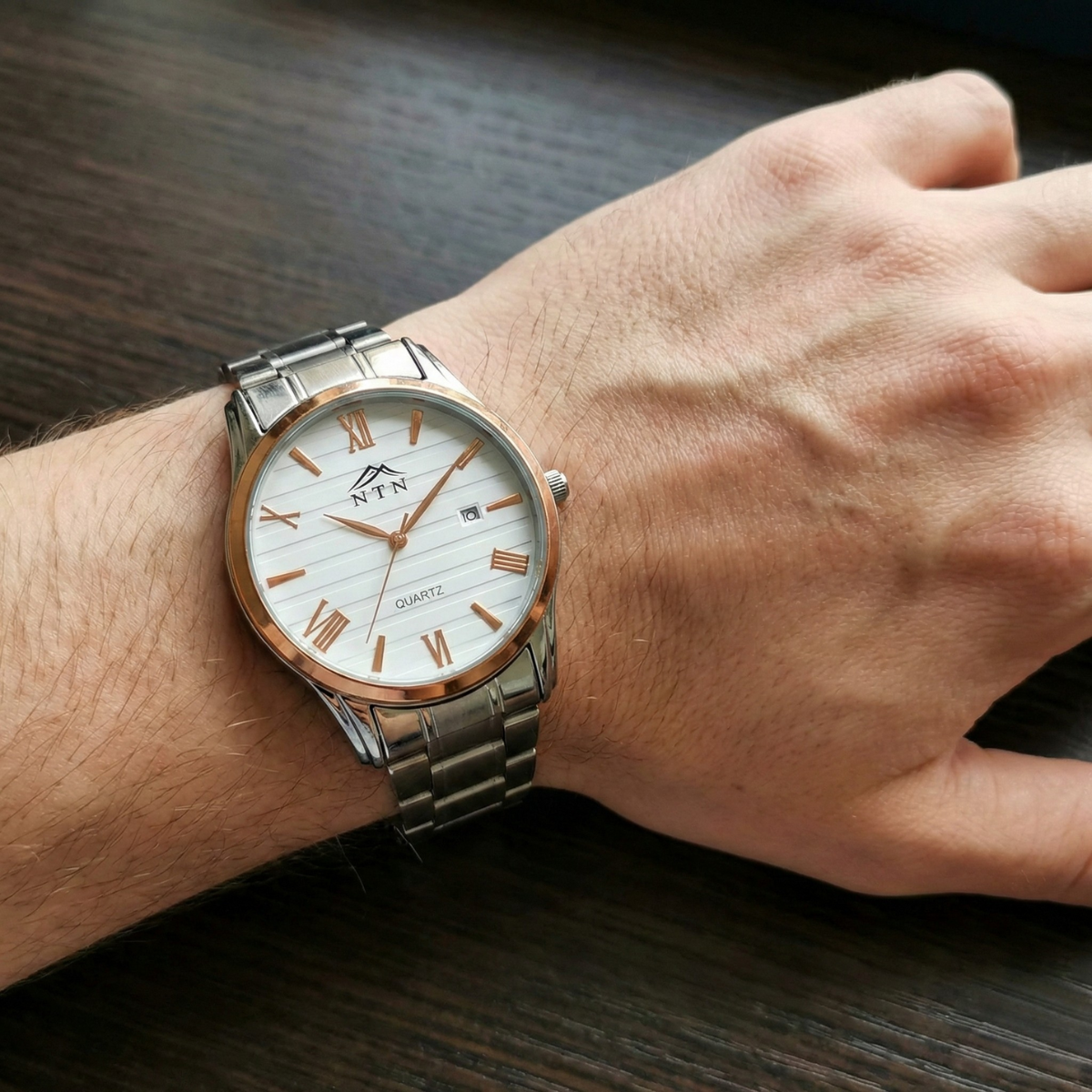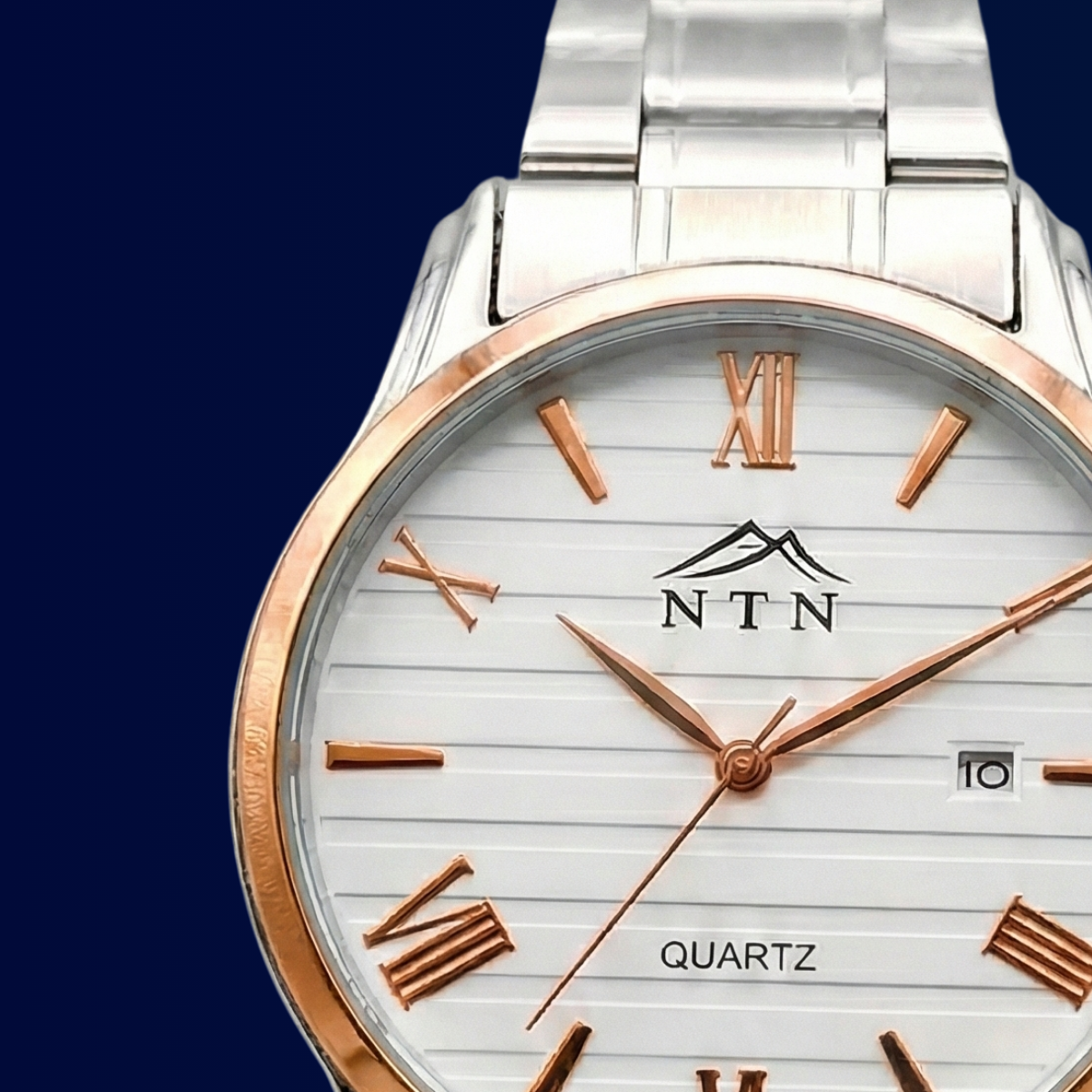 A refined NTN quartz analog watch with a textured white dial, rose-gold Roman numerals and a polished stainless-steel bracelet, finished with a discreet date window at 3 o’clock.