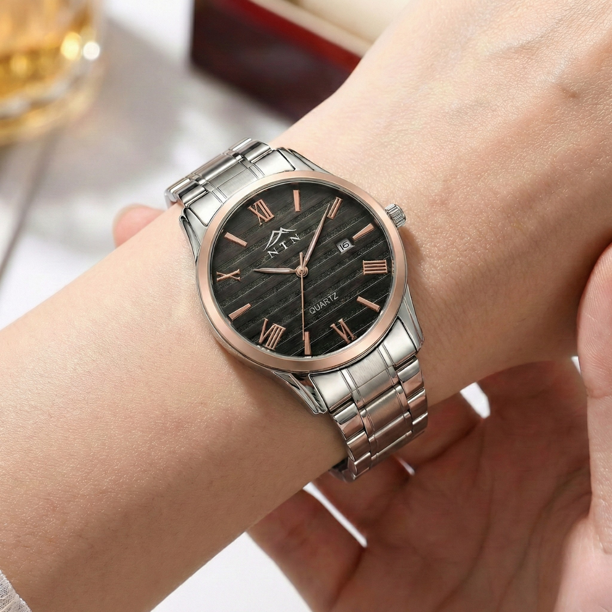 The NTN elegant Analog watch pairs a textured black dial with rose-gold Roman indices and slender hands for a polished, modern-classic look. Driven by a reliable quartz movement, it features a practical date display at 3 o’clock and a clear, easy-to-read layout. Housed in a polished fine-alloy case and a rose gold plated bezel with a matching bracelet, the watch is built to be comfortable for all-day wear. Versatile enough for office hours or evenings out, it delivers understated sophistication with dependable performance.