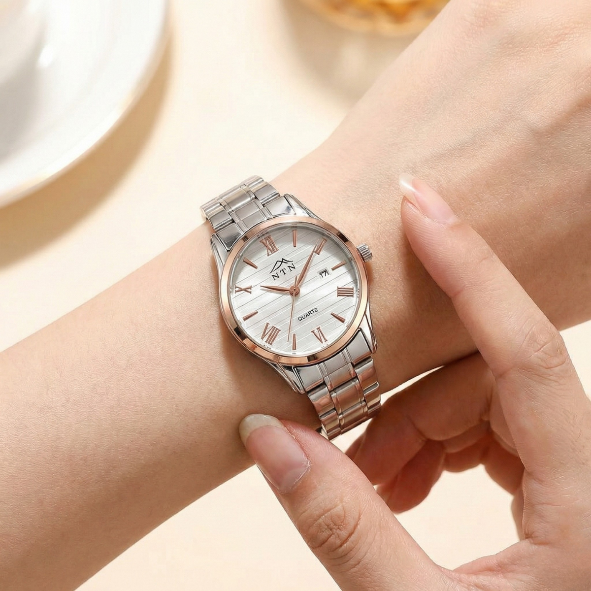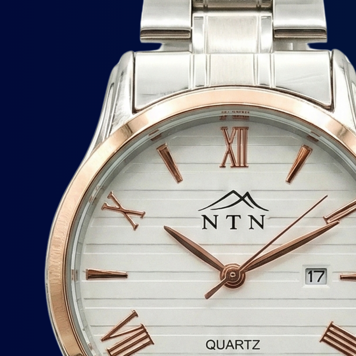 The NTN watch pairs a finely textured white dial with warm rose‑gold Roman numerals for a clean, refined appearance that lifts any outfit. A slim stainless‑steel case and matching strap deliver comfortable, balanced wear, while the neat date window at 3 o’clock keeps things simple and useful. Powered by a reliable quartz movement, this low‑maintenance watch is designed to be an easy go‑to for both office days and evenings out.