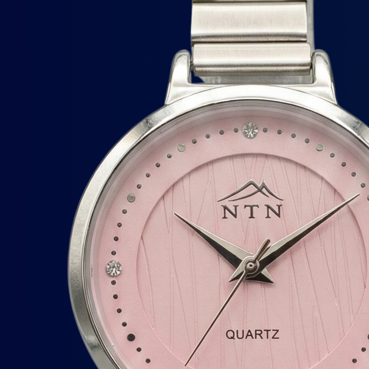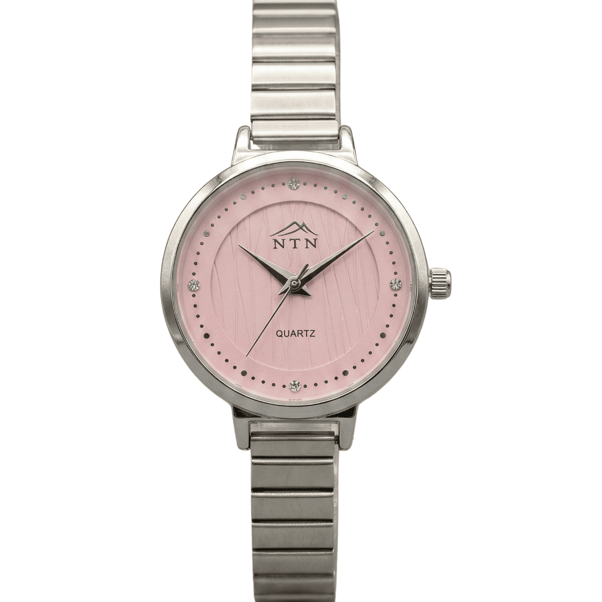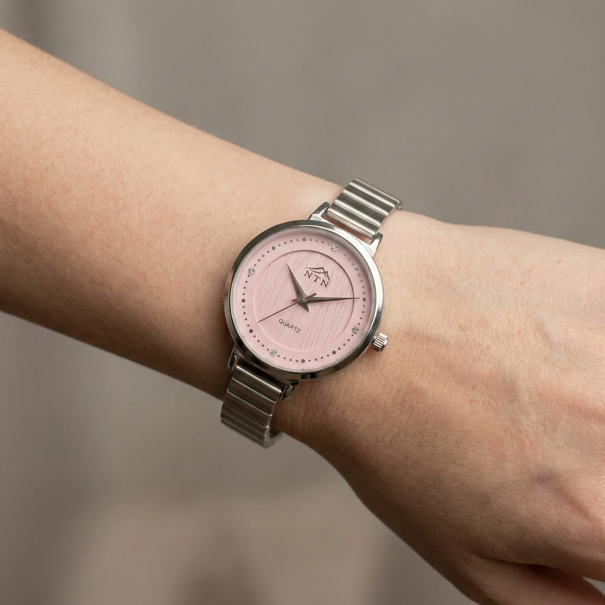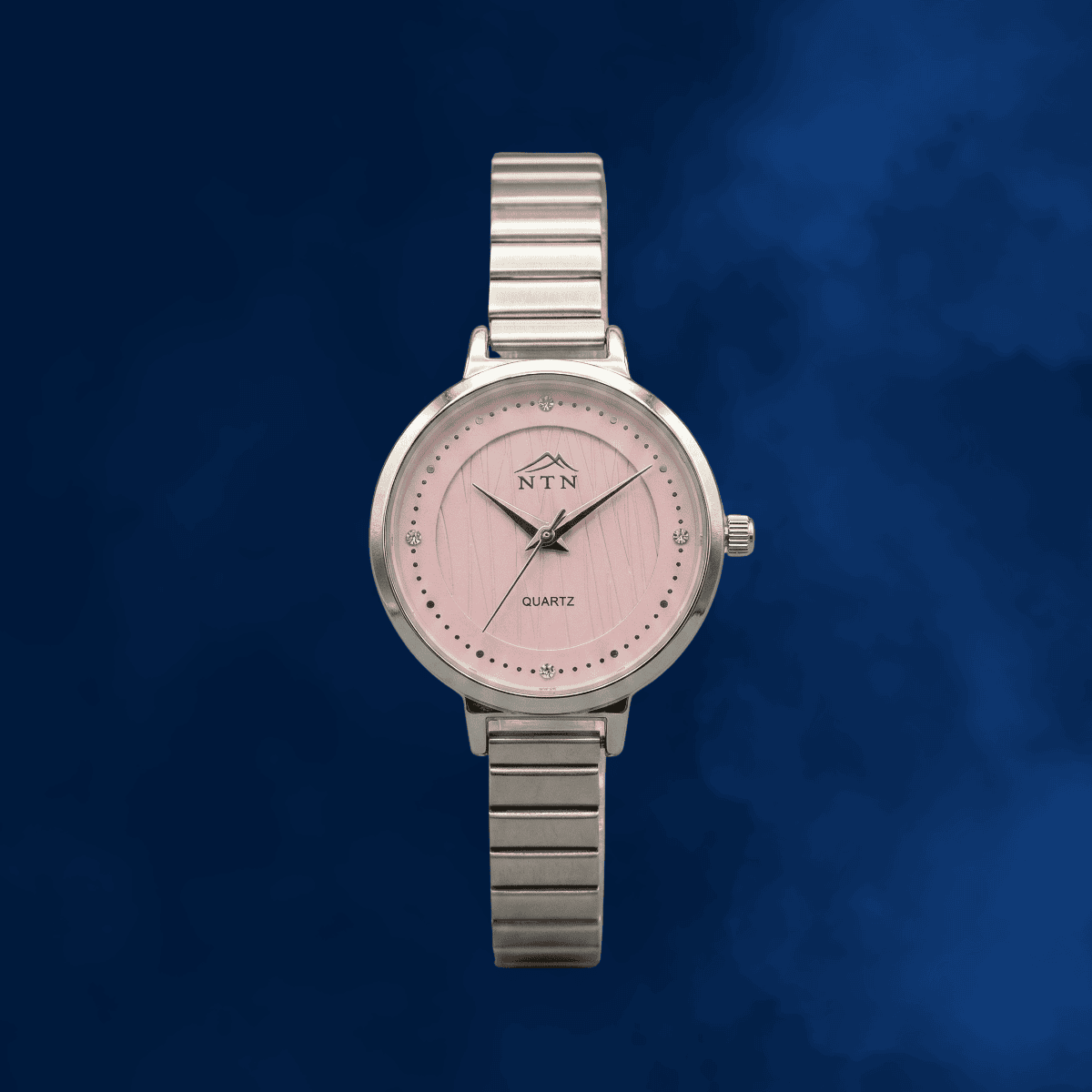 The NTN Elegant Quartz Watch combines precise quartz movement with delicate, feminine styling. Its pastel pink dial features subtle vertical texture, neat dot hour markers and four crystal accents set in a slim silver-tone case. Fitted with a polished metal bracelet, it delivers a comfortable, secure fit and effortless day-to-night elegance. Ideal as a dress piece or a polished everyday accessory.