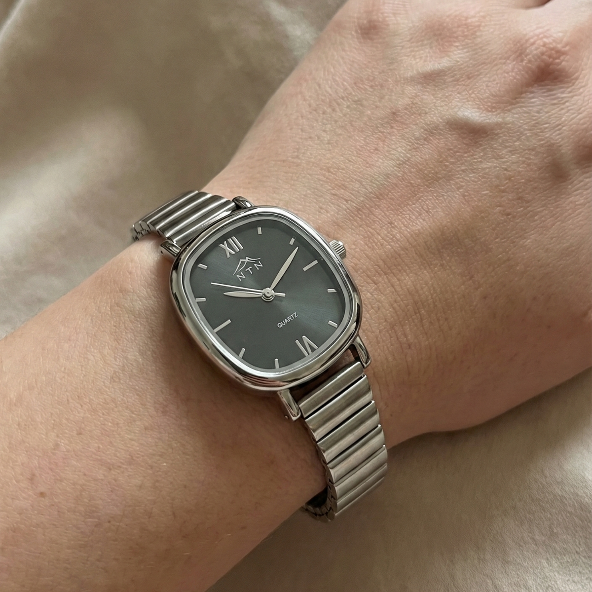 This cushion‑shaped analog watch with a deep black dial, minimalist Roman markers and a comfortable stainless‑steel bracelet delivers a sleek and clean look.