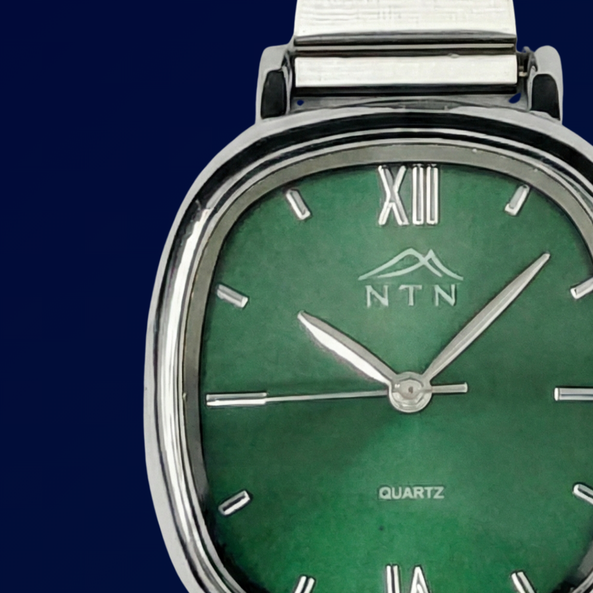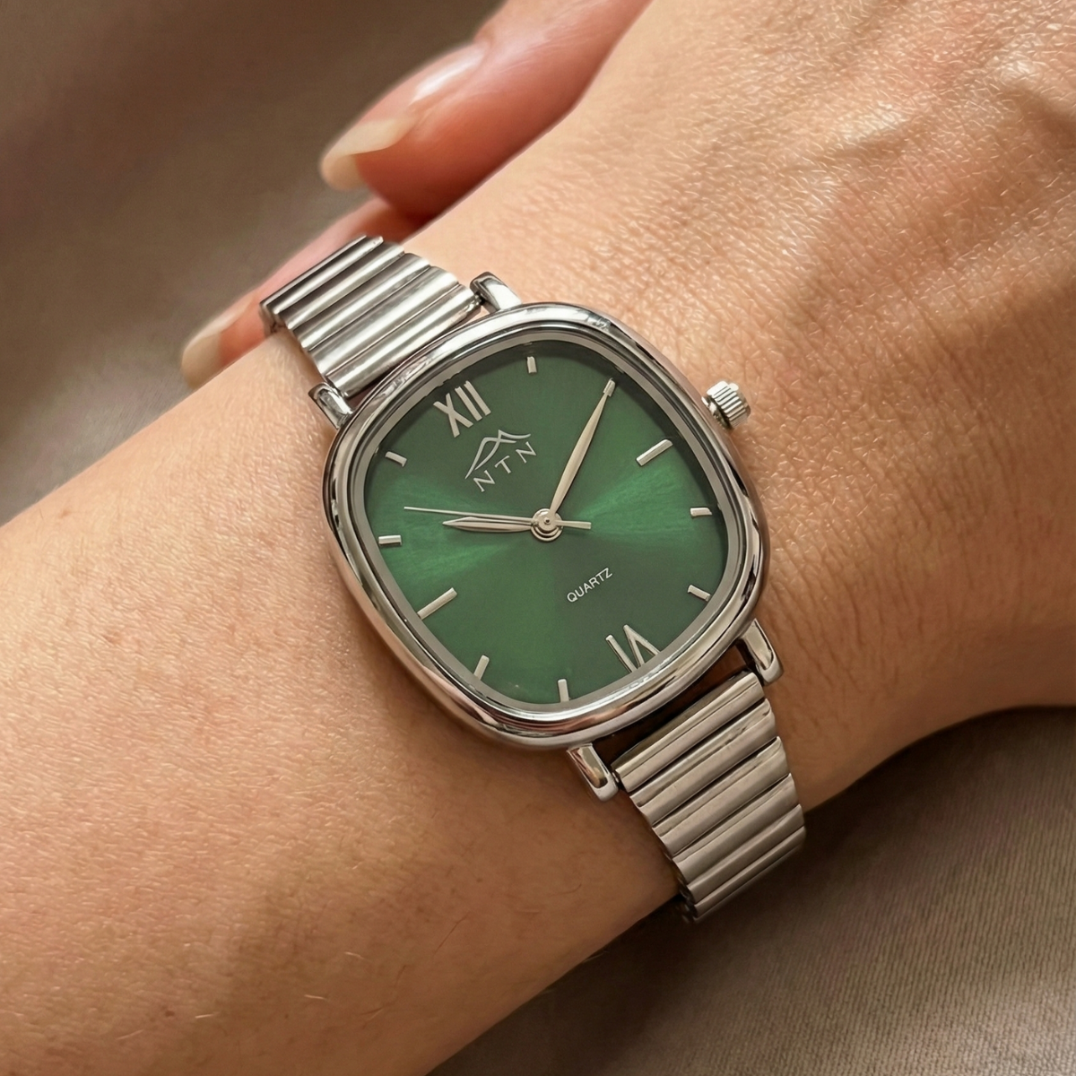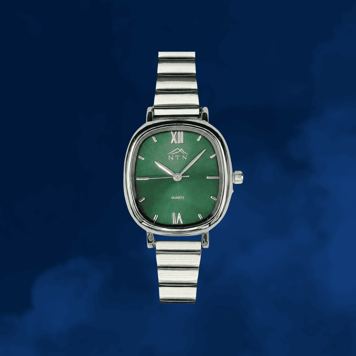 Designed for the modern woman who prefers refined simplicity, this elegant NTN Analog cushion-shaped watch features a soft‑rounded case and a luminous green dial that subtly shifts with the light. Slim silver indices and tapered hands keep the face clean and feminine, while a comfortable stainless‑steel strap adds polish and all‑day wearability. Powered by a dependable quartz movement, it’s a versatile day‑to‑night accessory that pairs effortlessly with both workwear and evening looks.