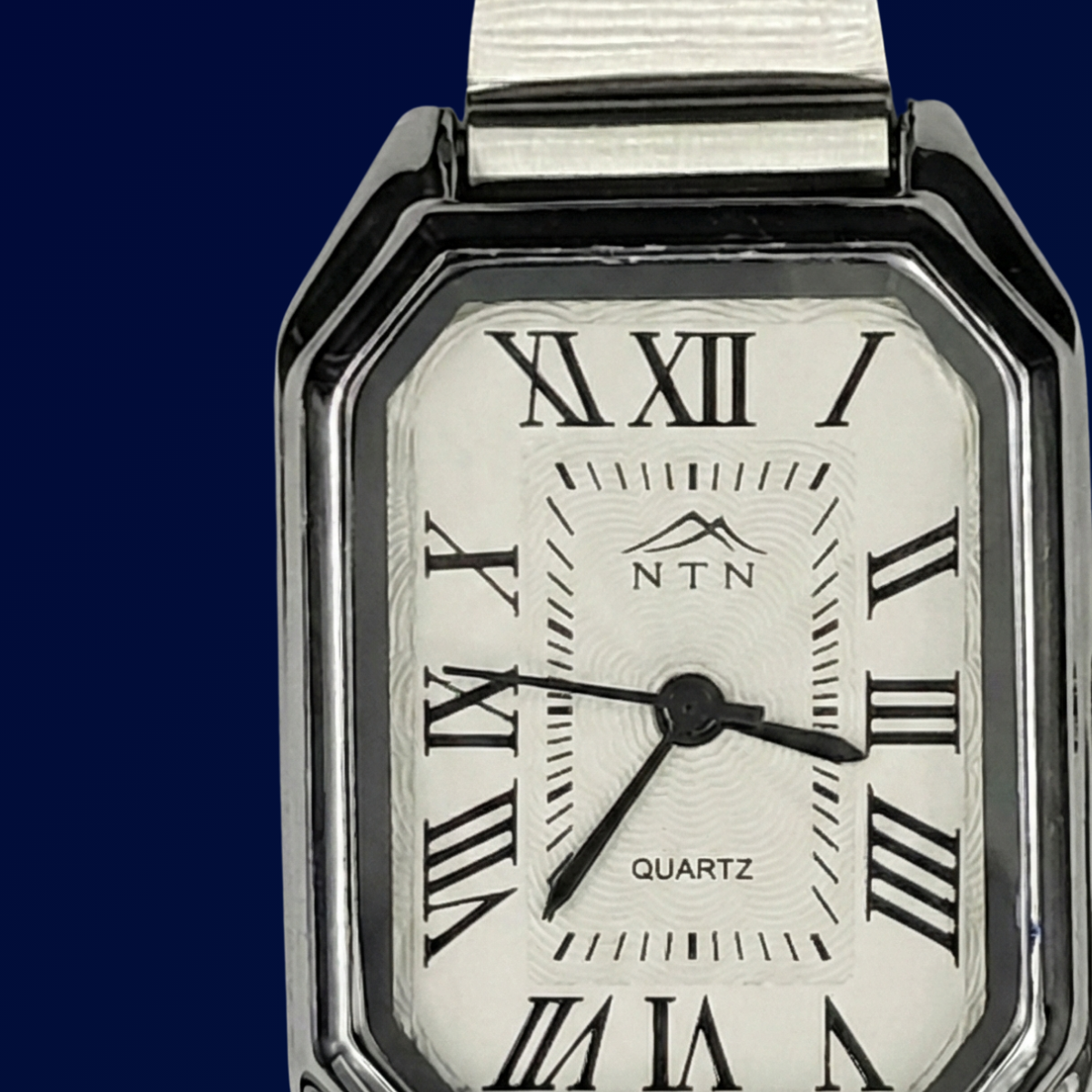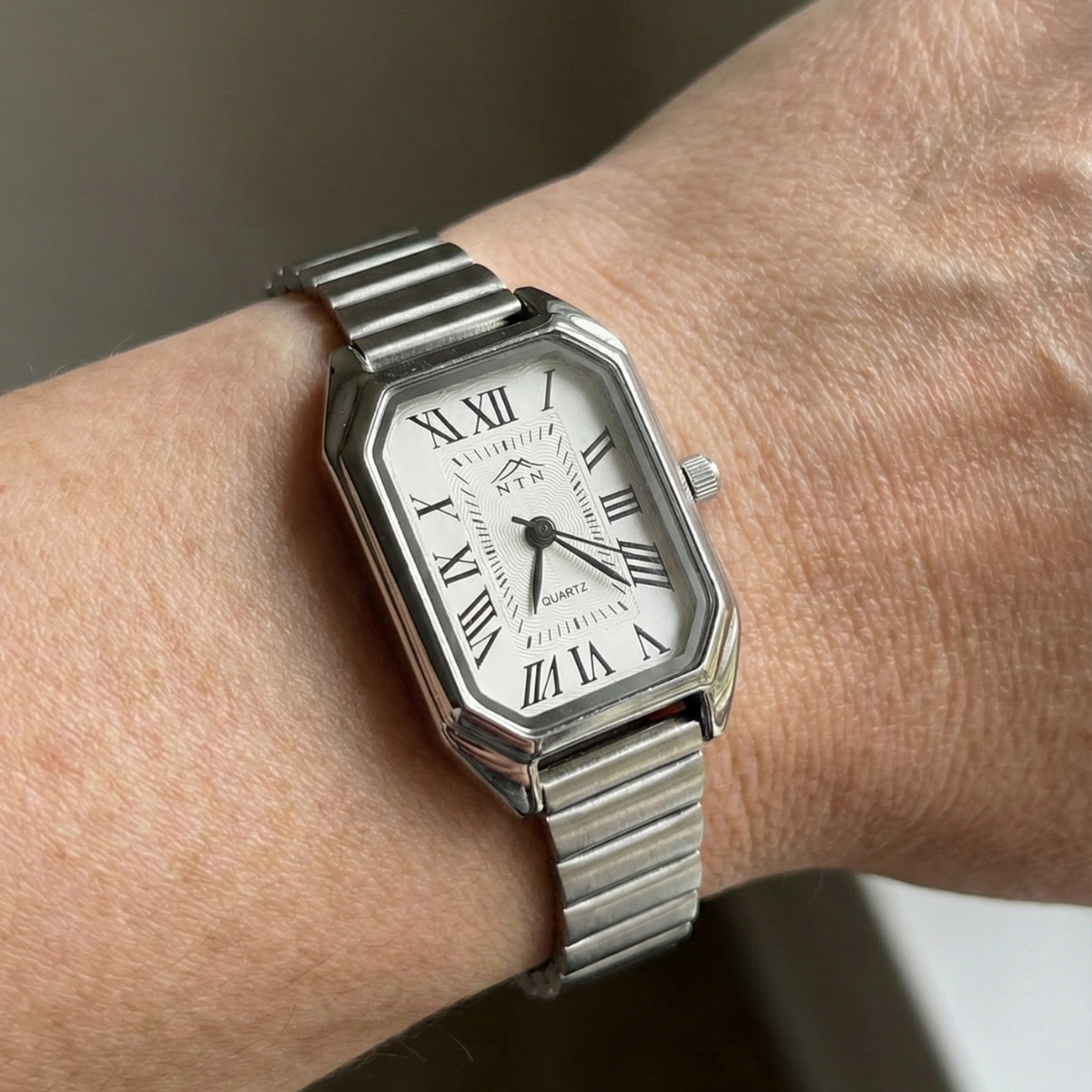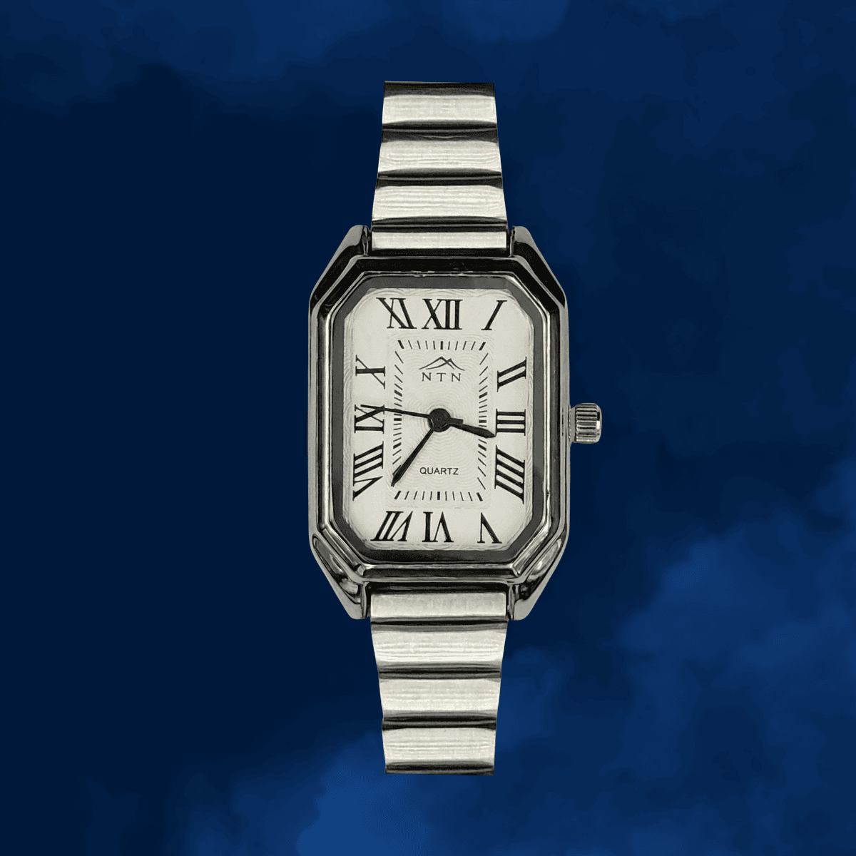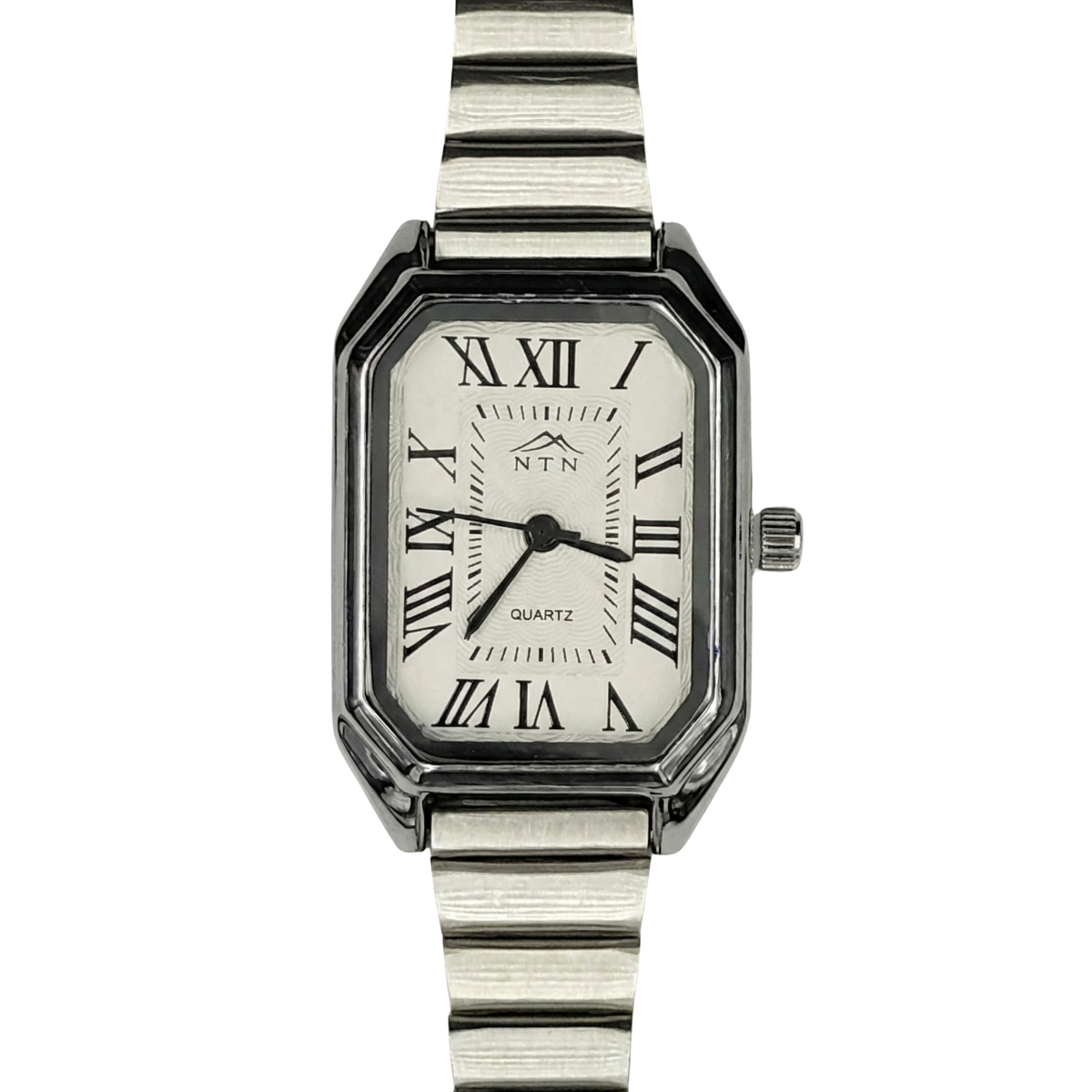 This NTN evergreen analog watch pairs dependable quartz movement with elegant, feminine design. Its rectangular ivory dial is set with bold Roman numerals and slim black hands inside a polished silver-tone case, while the stainless steel strap offers a comfortable, secure fit. Lightweight and understated, this watch moves easily from office hours to evening plans, making it a versatile accessory for everyday and special occasions.