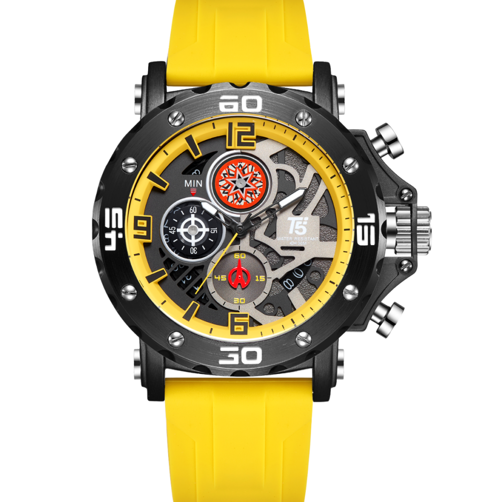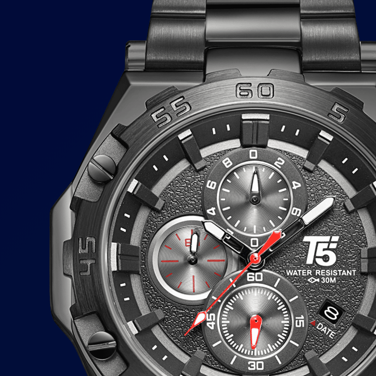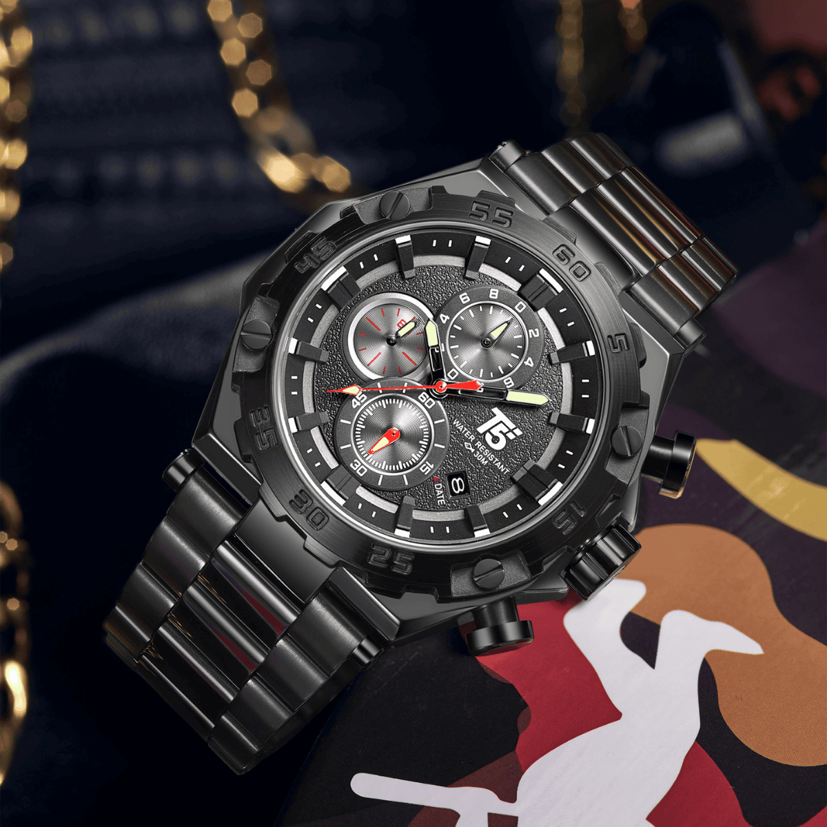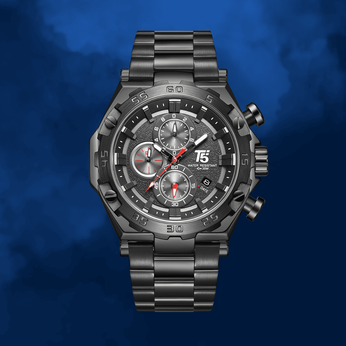 This black-dial T5 Chronograph Watch pairs rugged durability with sleek modern style, featuring a solid metal strap and precision Quartz Movement.