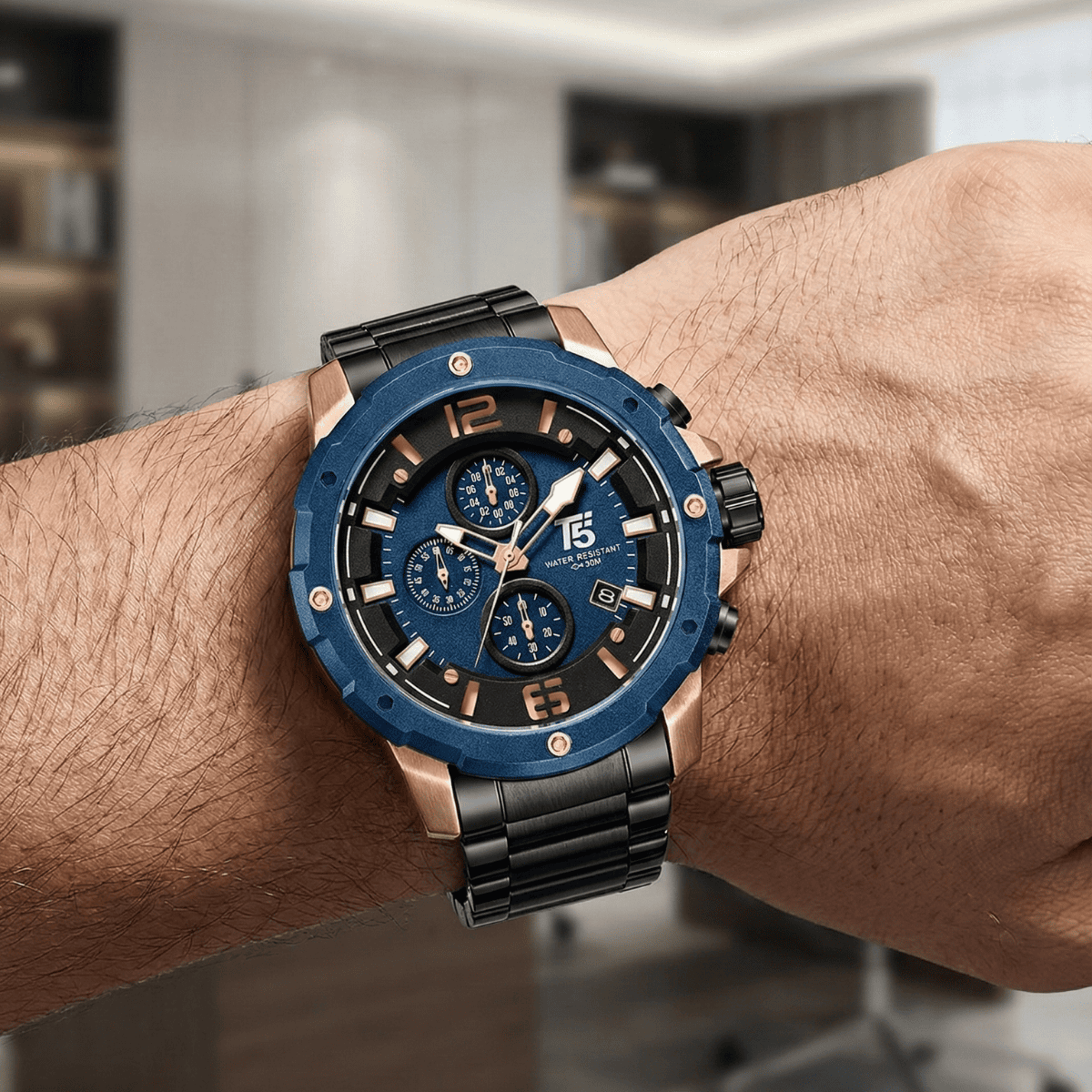 The T5 Quartz Multifunction Chronograph Watch captures the perfect balance of elegance and strength. Its deep blue dial, highlighted by rose gold accents, exudes a premium aesthetic while housing three functional sub-dials and a date display for everyday practicality. The durable metal strap compleMents the bold alloy case, ensuring both comfort and resilience. Water-resistant and built with high-performance Quartz Movement, this T5 Watch offers timeless sophistication and dependable accuracy?ideal for those who appreciate style and substance in equal measure.